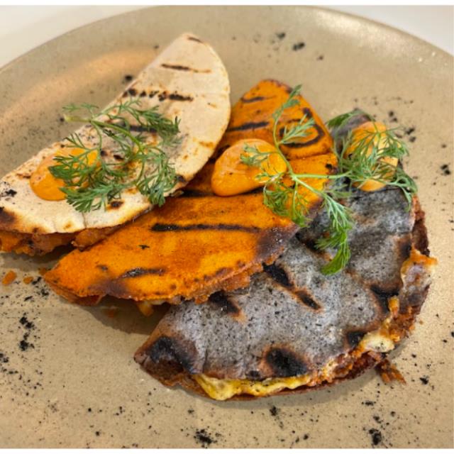 3 PIEZAS DE TORTILLA DE MAIZ, FRIJOLES PUERCOS CON MANTECA, QUESO MANCHEGO DORADOS A LAS BRASAS.