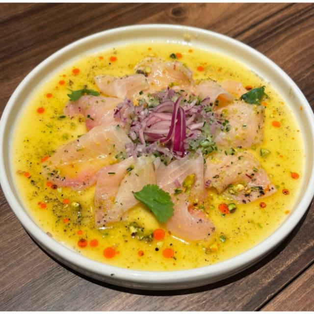 FIELTE DE PESCADO EN FINAS LAJAS, CEBOLLA MORADA,CILANTRO, BAÑADO EN LECHE DE TIGRE DE MARACUYA.