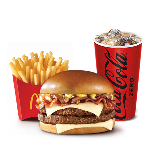 Hamburguesa con 2 carnes de res, queso americano, cebolla, pepinillos, cátsup y mostaza. Incluye papas y refresco de 21oz.