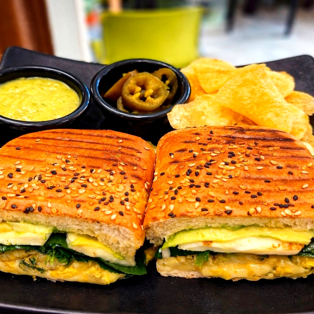 Panini con pimientos al sartén, champiñones, 3 quesos , espinacas