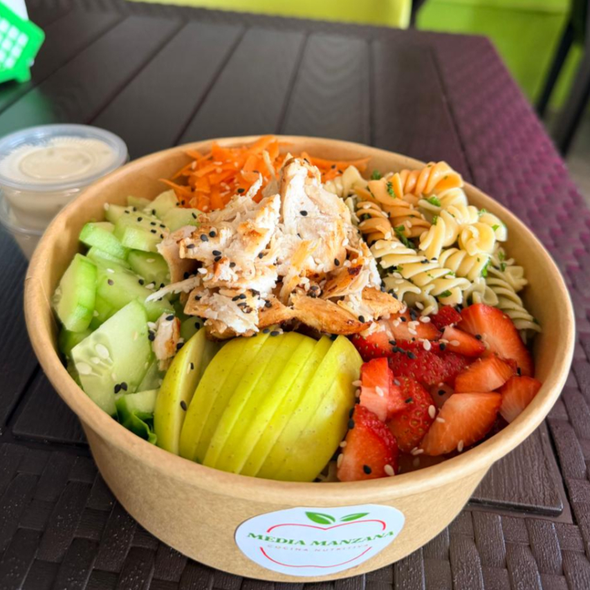 Base de lechuga orejona, pollo natural,1/2 manzana verde, pepino, zanahoria, 3 quesos, fresas, semillas de ajonjoli, tiras de maiz y gratis 1/4 de lentejas