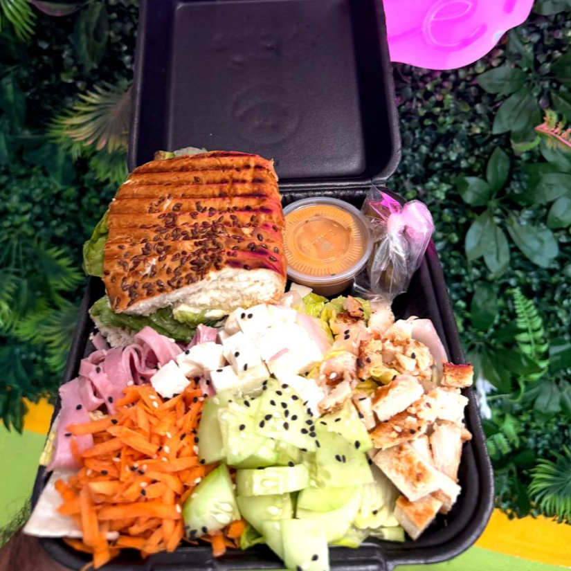 elegir 3 ingredientes de barra, elejir proteina, natural o bañada en algun aderezo, crtonones o tiras de maiz