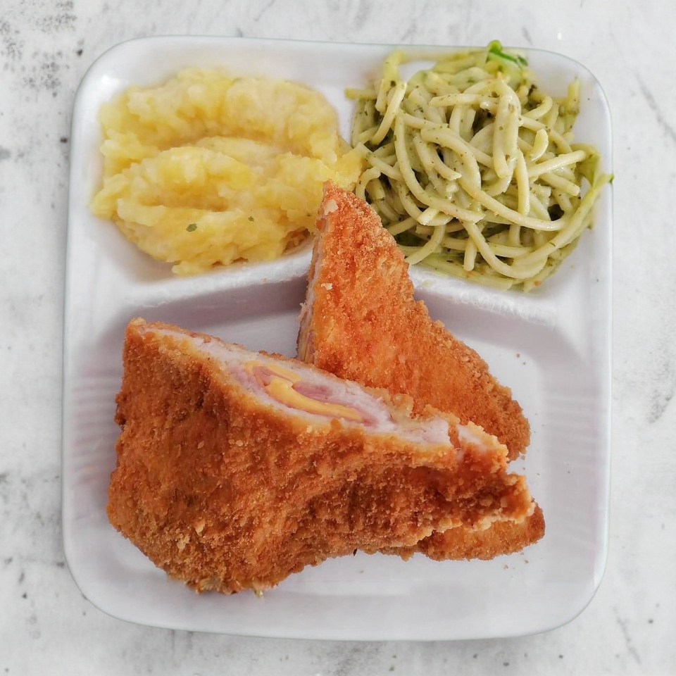 Pechuga de pollo rellena de jamon de pavo y queso amarillo con tus guarniciones favoritas