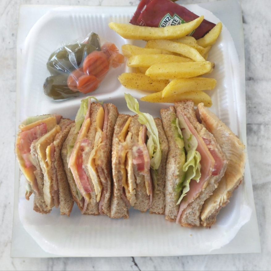 Sandwich con jamon, queso, tomate, lechuga, aguacate, aderezo y pechuga de pollo, acompañado de papas fritas y jalapeño