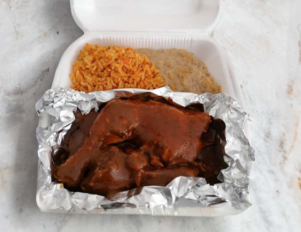 Pierna y muslo en mole, salsa de chipotle ó salsa de cilantro acompañado de tus guarniciones favoritas