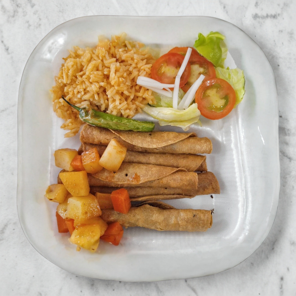 Tacos de maiz dorados de desebrada ó picadillo acompañadas de ensalada verde, papa y zanahoria