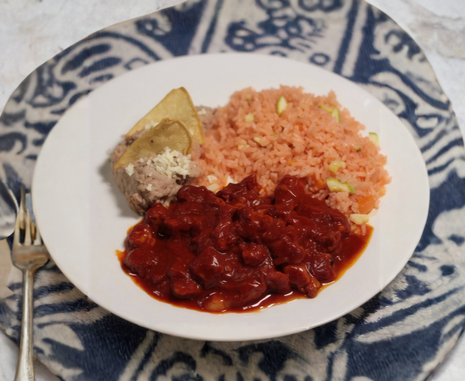 Carne de puerco con el adobo tradicional preparado con receta 100% casera, acompañdado de tus 2 guarniciones favoritas