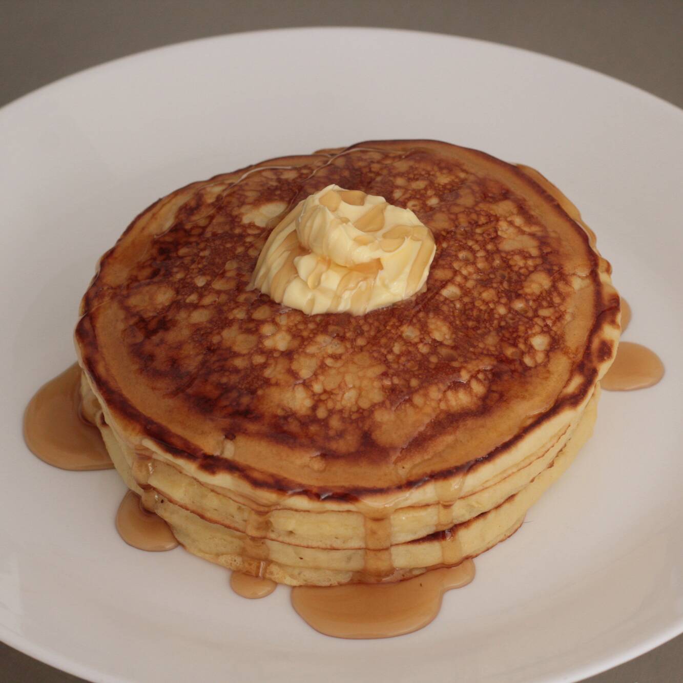 Deiciosos hot cakes para empezar bien el dia, acompañados de miel maple y mantequilla