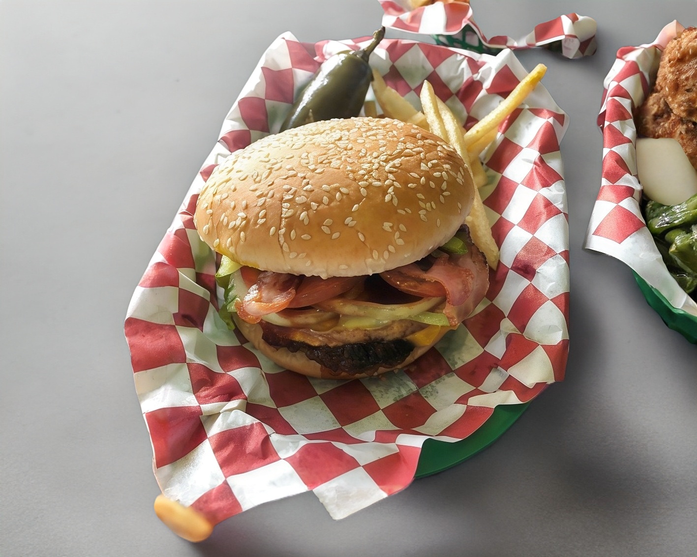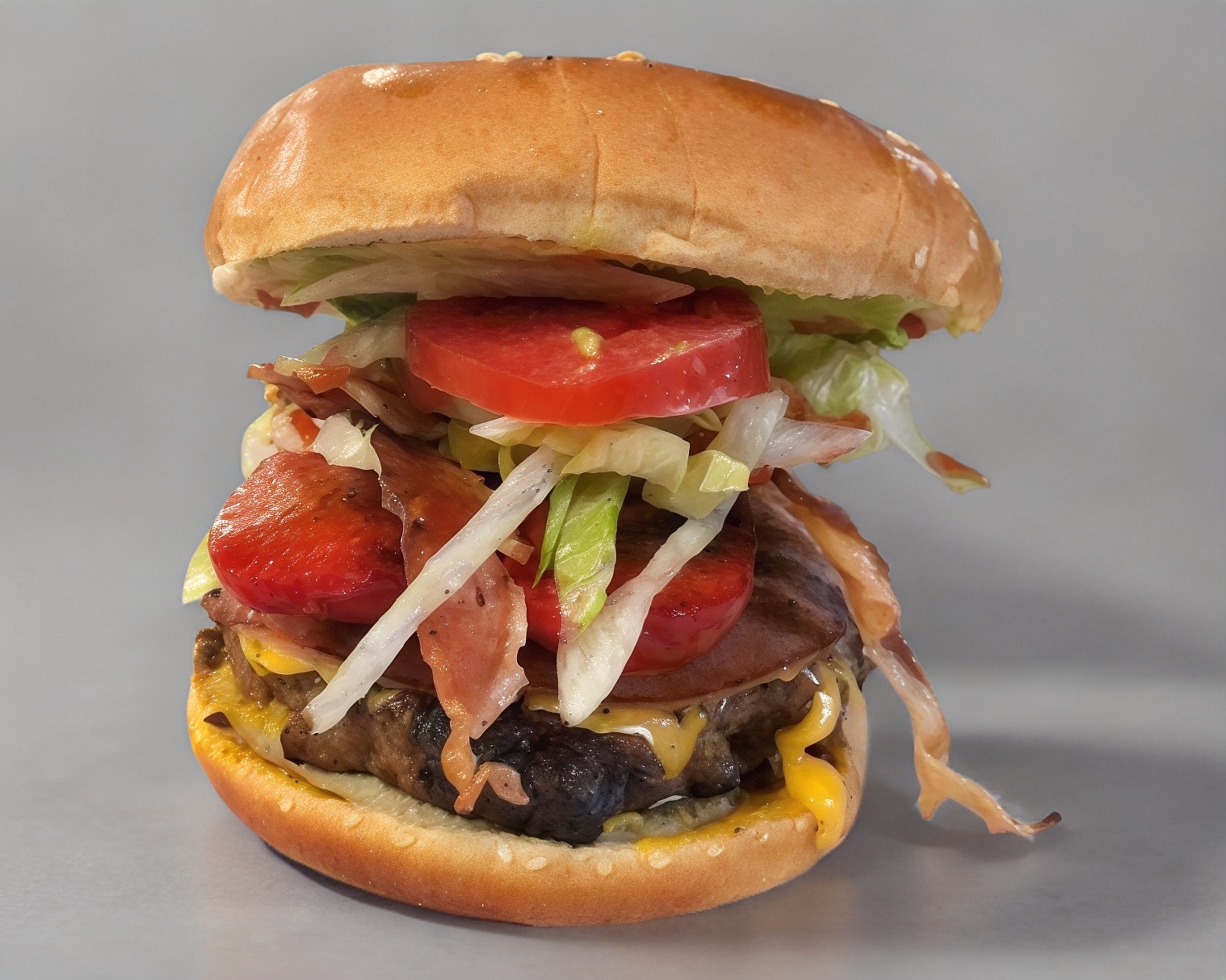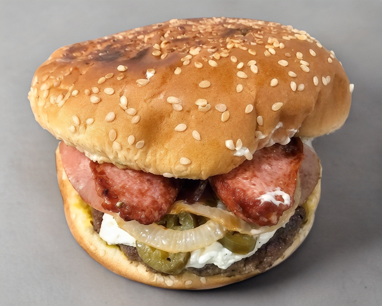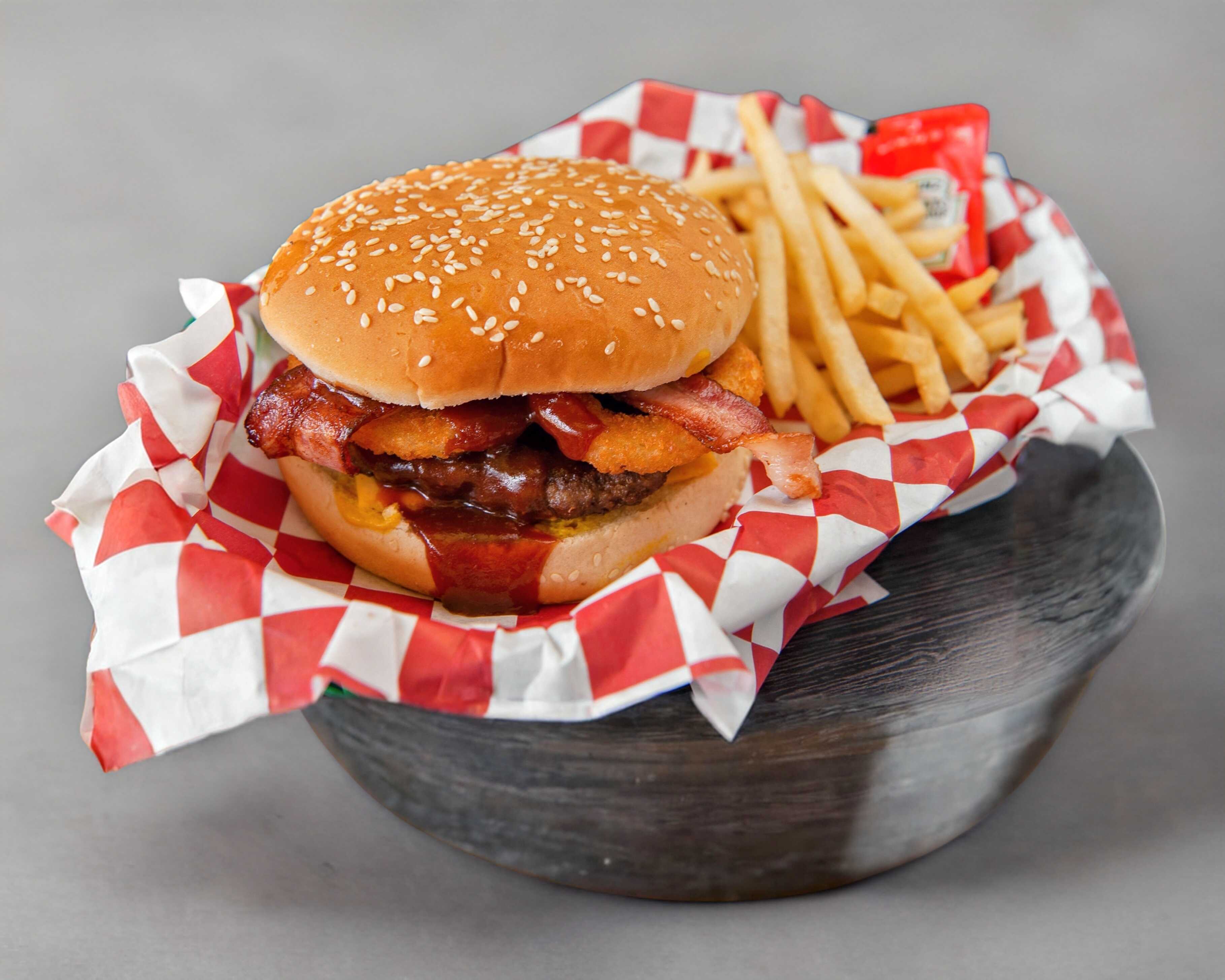 Pan tradicional Carne, queso americano, tocino, aros de cebolla, mayonesa y salsa BBQ.