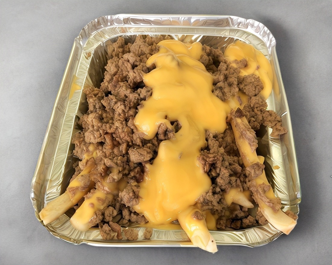 Papas a la francesa con carne y queso amarillo. Contenedor de 6x6 pulgadas.