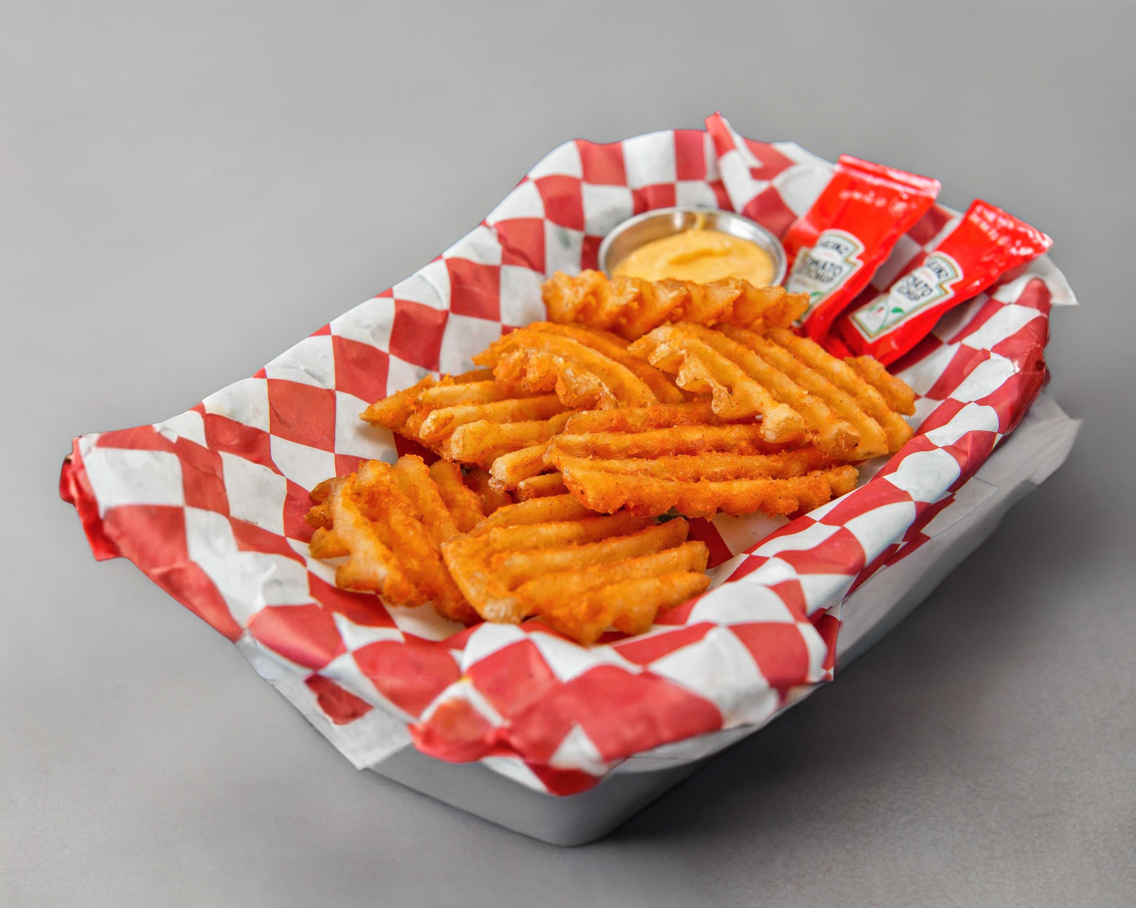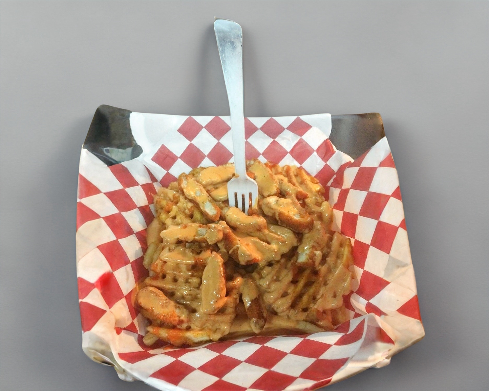 Papas a la francesa, papas crisscut, trocitos de pollo empanizado, bañadas en salsa búfalo, ranch, spicy y queso.