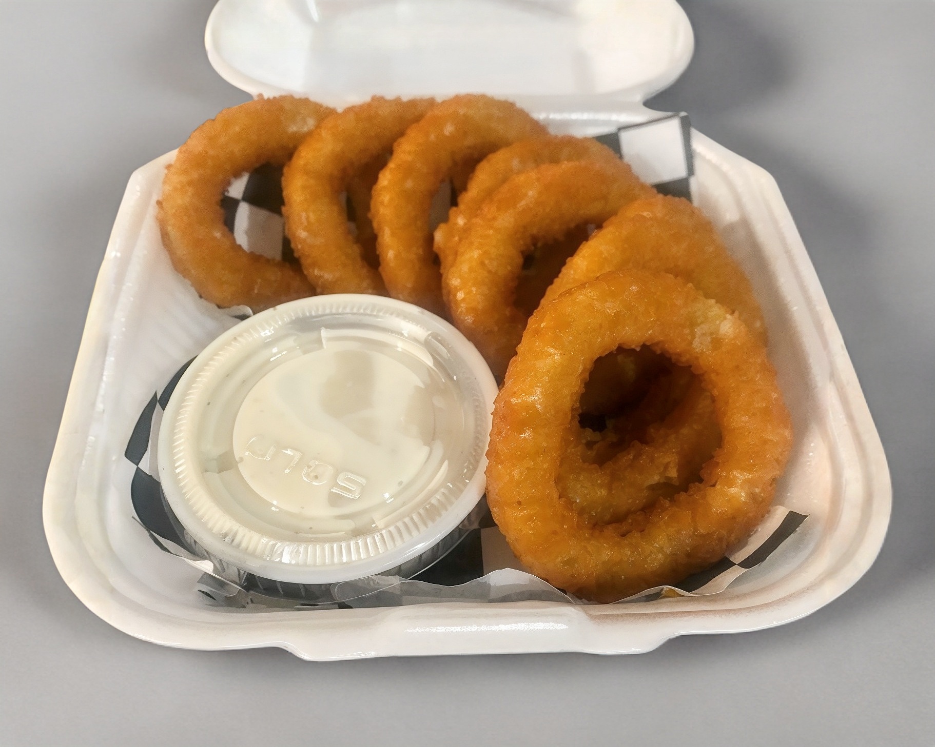 Carne, queso americano, aros de cebolla y salsa búfalo Meny´s.