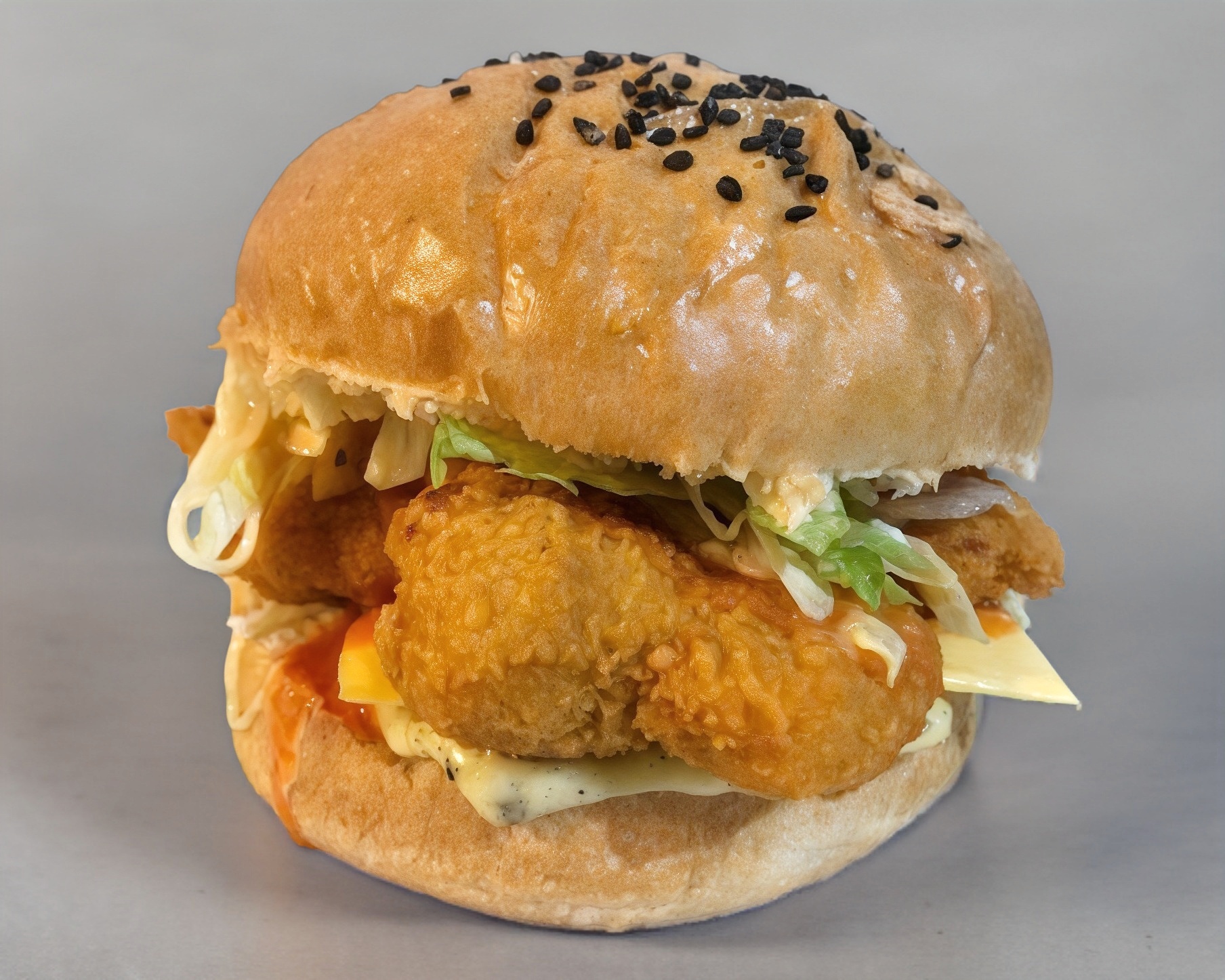 Pan, boneless de pechuga, queso blanco, queso amarillo, lechuga, tomate, salsa búfalo y ranch.