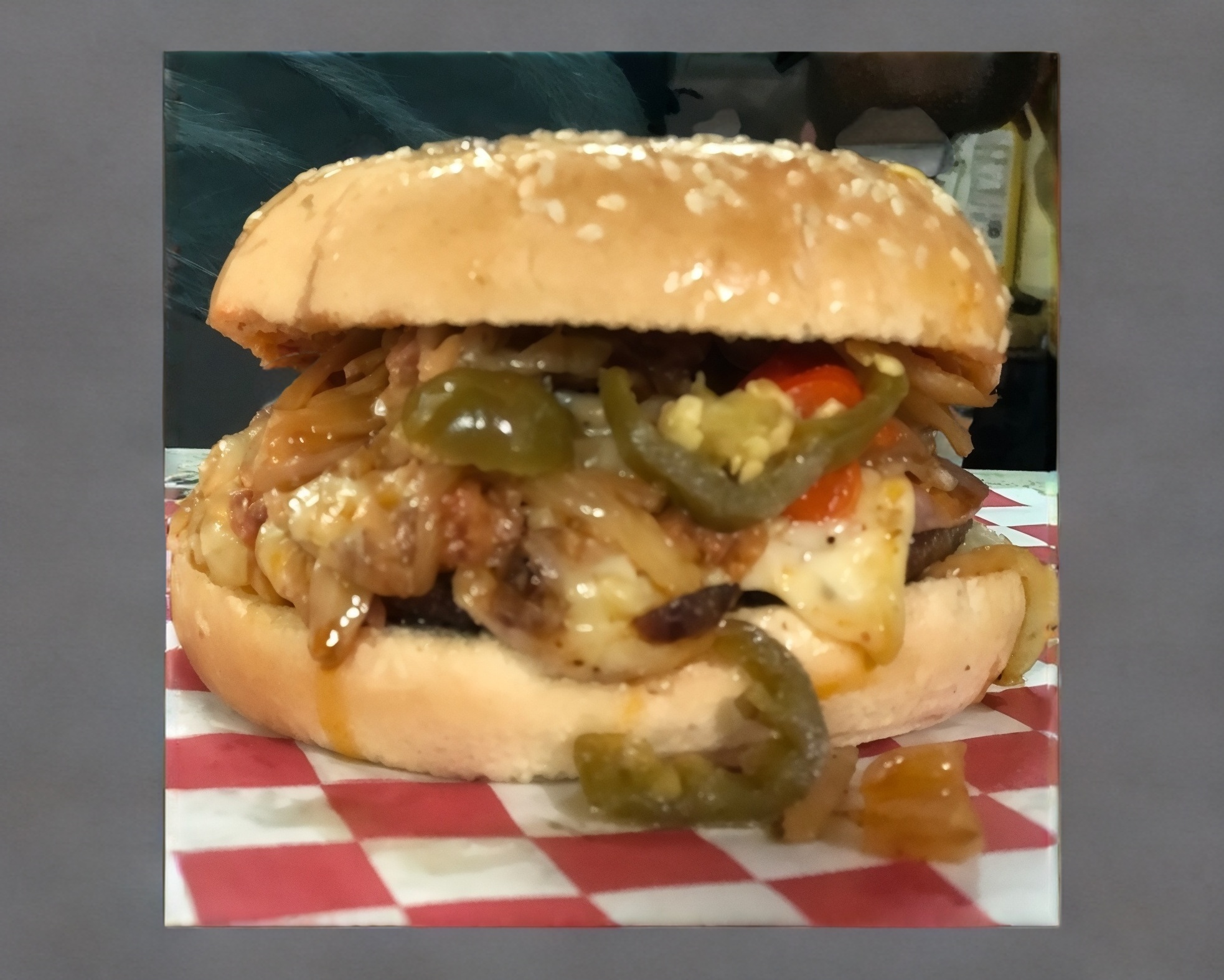 Carne, queso Philadelphia, salchicha polaca, cebolla salteada, jalapeños, mayonesa y mostaza.