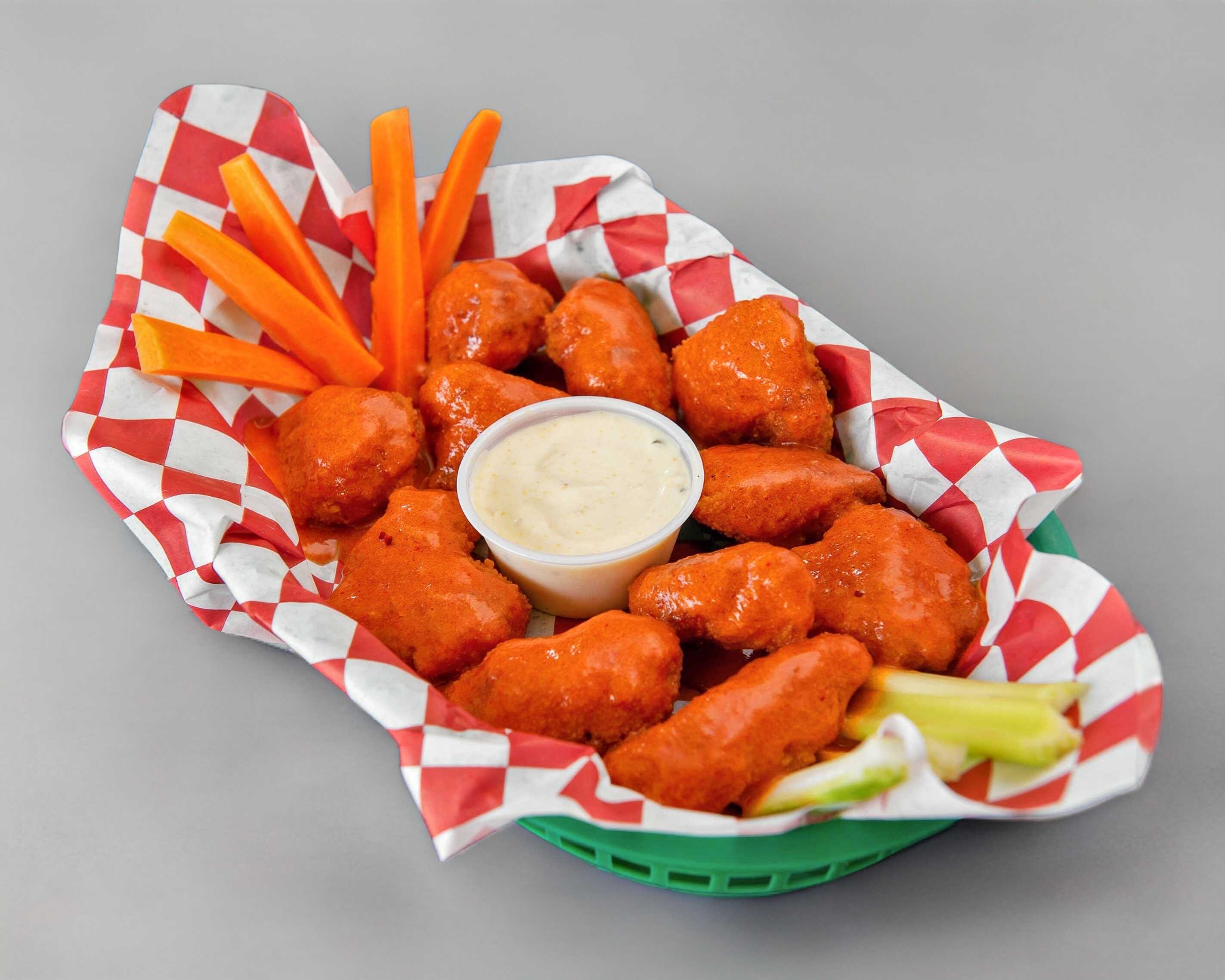 400 g De trocitos de pechuga empanizada, bañados en salsa búfalo, acompañadas de apio, zanahoria y aderezo.