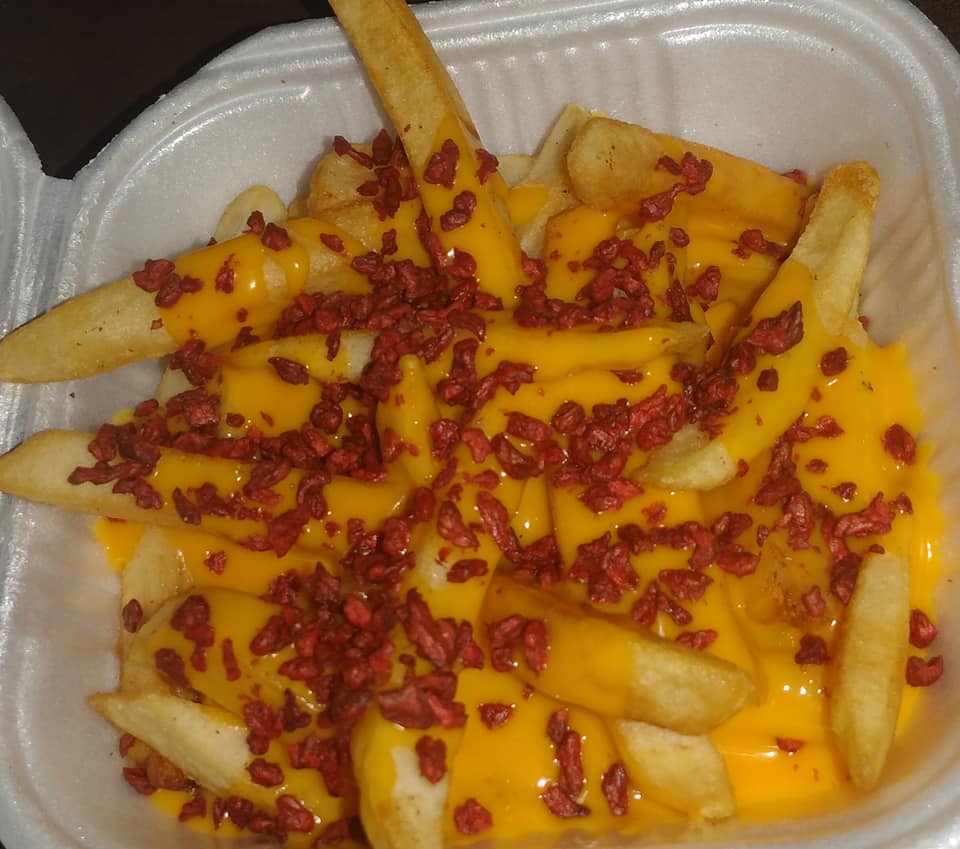 Orden de 200 gramos. Papas a la francesa bañadas en queso amarillo y trocitos de tocino.