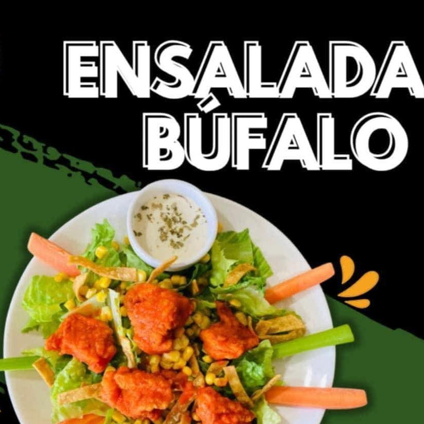 Mezcla de lechuga, zanahoria rayada, cubitos de tomate, trocitos de tocino, tiras de tortilla frita, queso panela y pechuga de pollo a la plancha o empanizada, bañado en salsa buffalo o natural, acompañado de aderezo ranch.