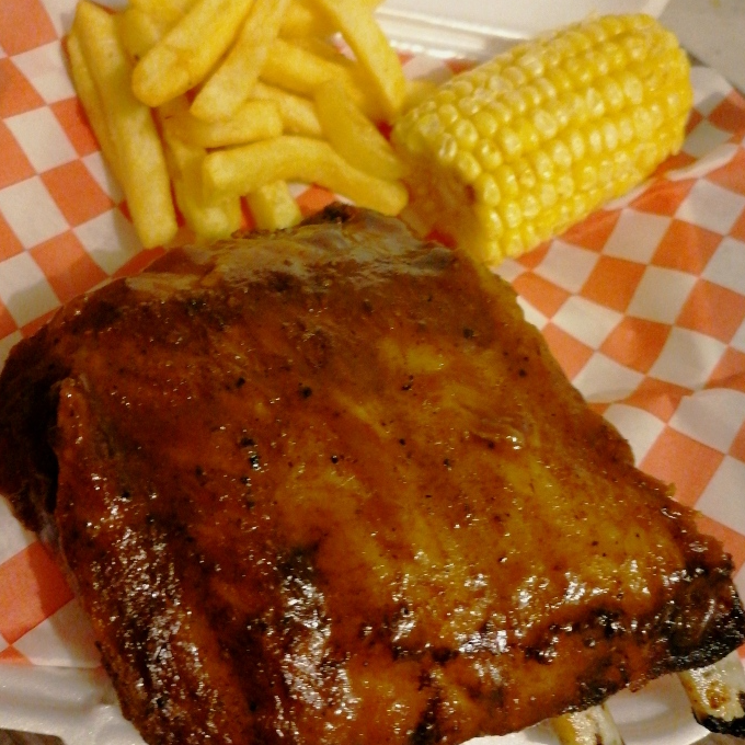 350gr Costilla de puerco bañado en salsa BBQ, acompañada de papas a la francesa, medio elote y salsa BBQ.