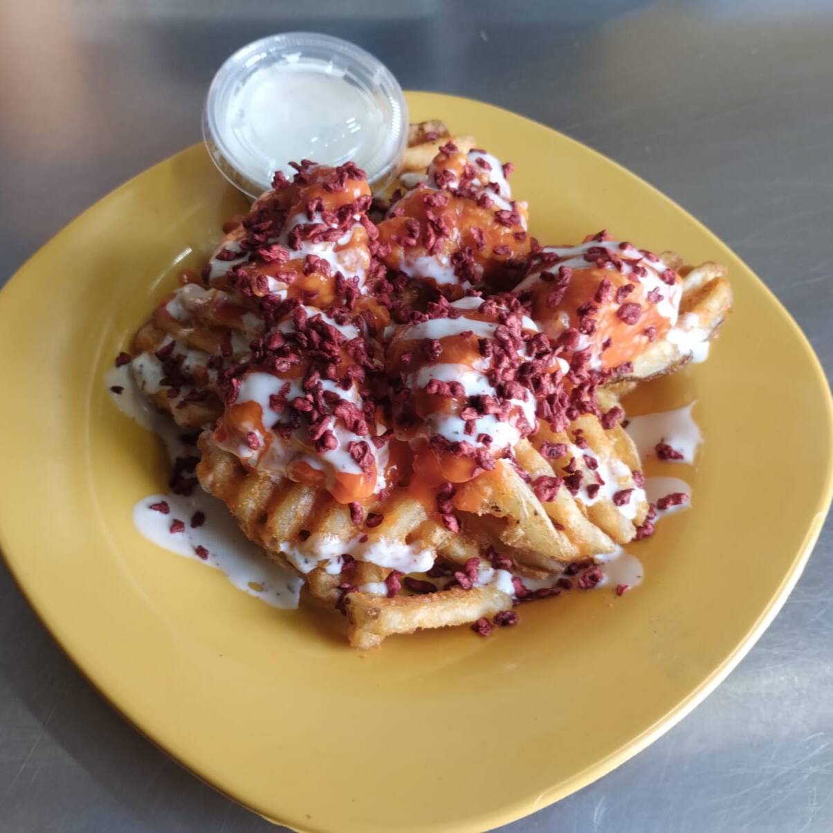 5 pz de boneless bañados en la salsa de tu preferencia servidos sobre papas criscut todo bañado con aderezo ranch y tocino deshidratado