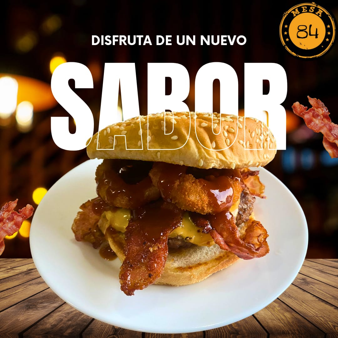 hamburguesa de res con 2 pz de aros de cebolla 3 pz de tocino salsa bbq y papas a la francesa