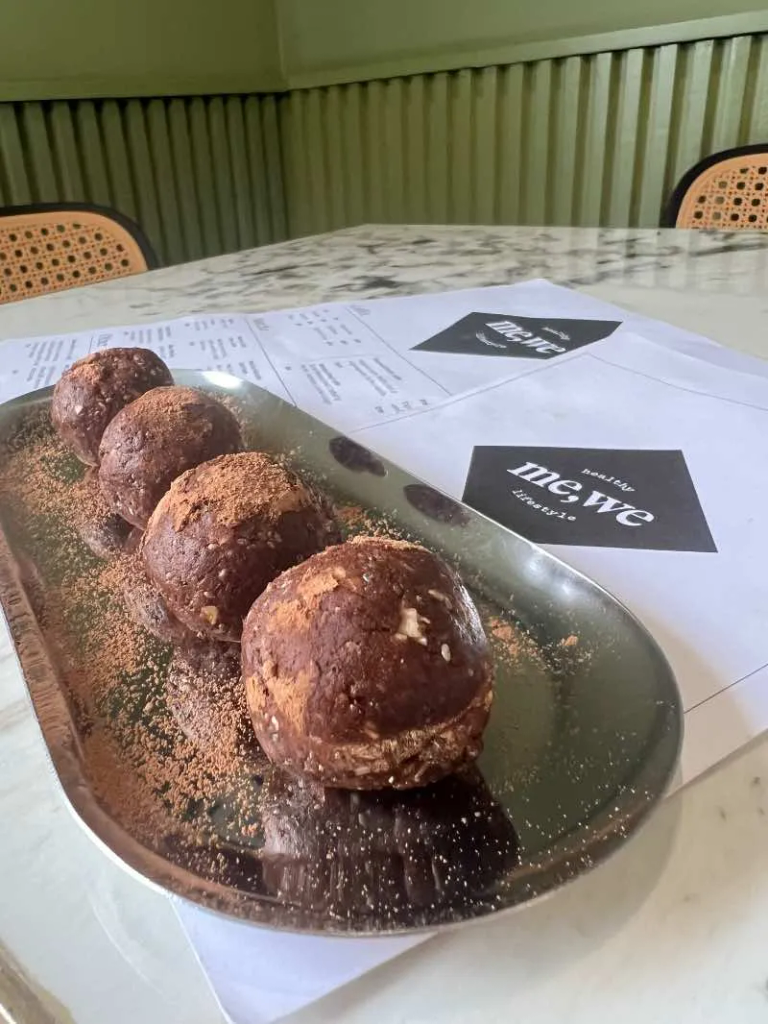 Snack natural de energía hecho con dátiles, crema de cacahuate, cacao, avena y chía. Fuente de proteína vegetal y fibra, perfecto para acompañar café, matcha o smoothies.