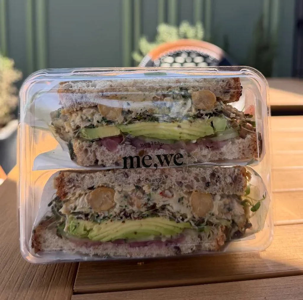 Pan de granos, pimientos,tomate, cebolla morada, queso manchego, pechuga rostizada,espinacas, aguacate y hummus de betabel