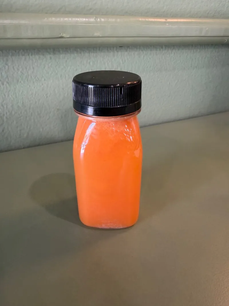 Jugo de naranja natural, zanahoria, jengibre fresco, curcuma prensado en frio y agua de coco. Refuerza tu sistema inmune de forma natural. Rico en Vitamina C, Antiinflamatorio y energizante.