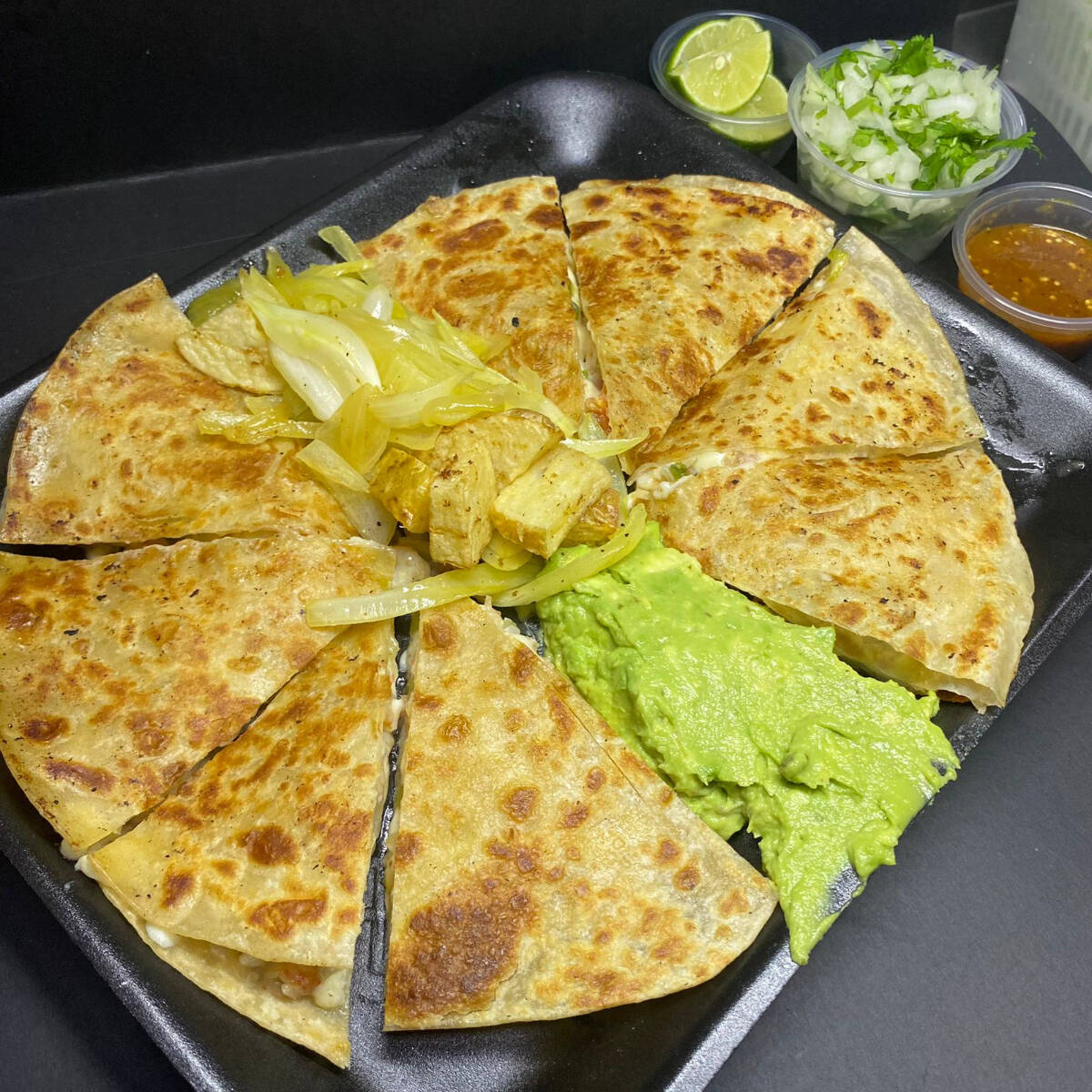 Dos tortillas grandes de harina en sincronizada, rellena de queso asadero y pollo a la parrilla picado. Complementos: cebolla y papa cocida sazonada, guacamole, limones, salsas y cebolla con cilantro.