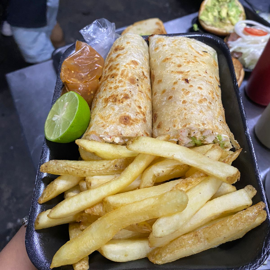 Tortilla de harina grande, partida por la mitad, rellena de queso asadero, guacamole y pollo parrillado cortado cuadros. Complementos: Papas a la francesa, limon y salsa.
