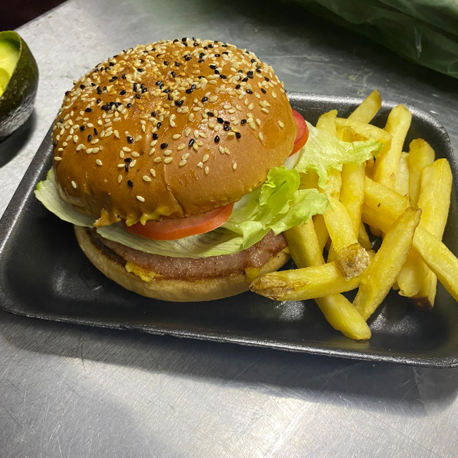 Pan para hamburguesa, con aderezos (mayoneza, cátsup y mostaza), encima carne de hamburguesa cocida a la parrilla, jamon, queso amarillo americano, lechuga, tomate, cebolla, aguacate y pan. Complementos: Papas a la francesa y chile en vinagre