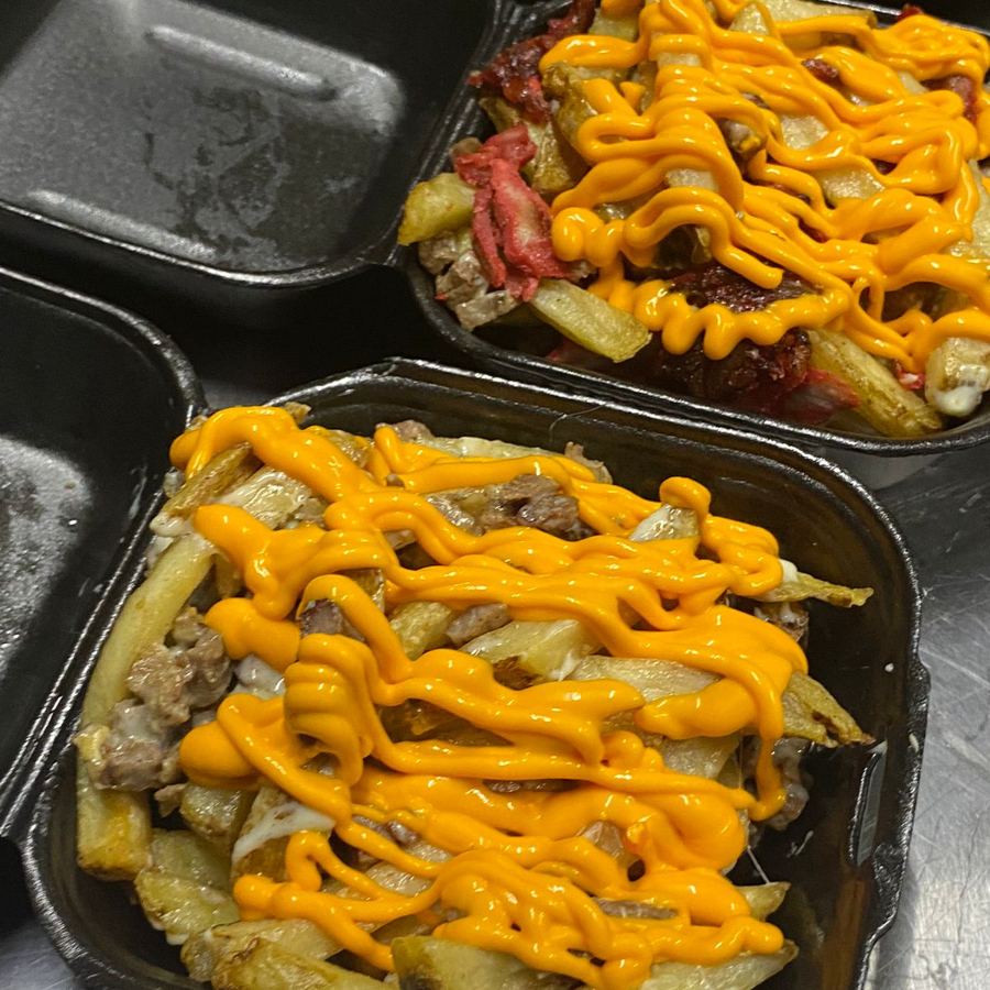 Papas a la francesa, con queso asadero, carne de trompo y bisteck, bañado en queso amarillo liquido.