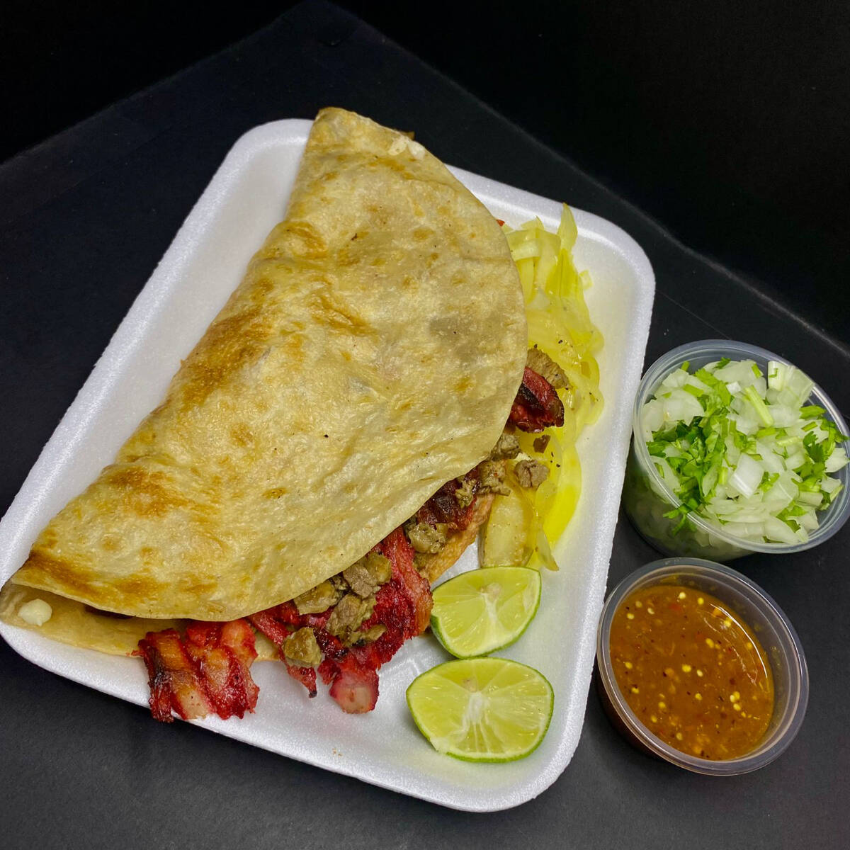 Dos tortillas grandes de harina en sincronizada, rellena de queso asadero y carne de trompo y bistec. Complementos: cebolla y papa cocida sazonada, guacamole, limones, salsas y cebolla con cilantro
