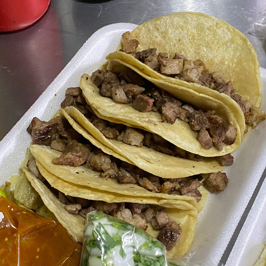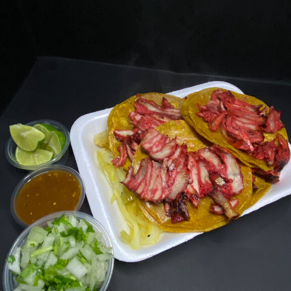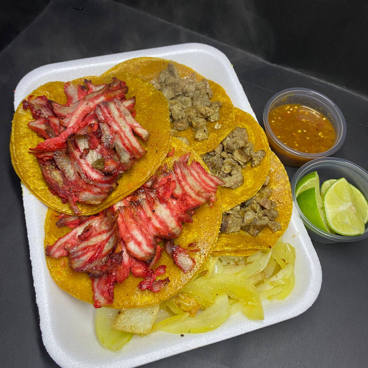 Doble tortilla amarilla, tamaño mediano, bañada en aceite, con carne de trompo y bisteck. Complementos: Cebolla salteada sazonada y papas, con limon, salsas y cebolla y cilantro.