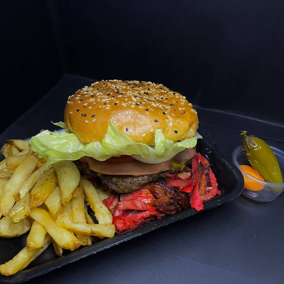 Pan para hamburguesa, con aderezos (mayoneza, cátsup y mostaza), encima carne de trompo con hamburguesa de res cocida a la parrilla, jamon y queso americano, lechuga, tomate, cebolla, aguacate y pan. Complementos: Papas a la francesa y chile en vinagre