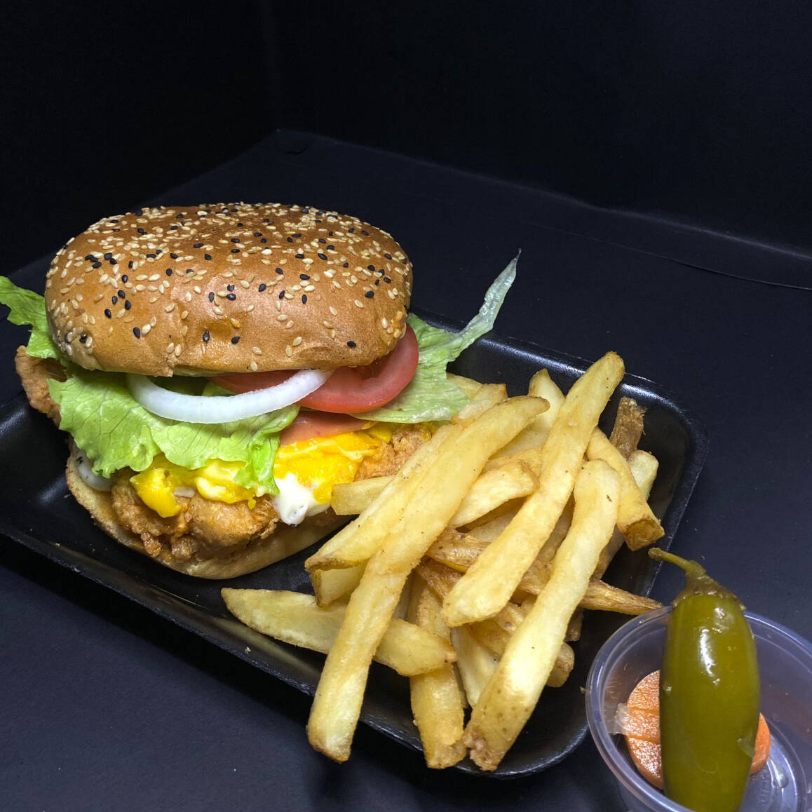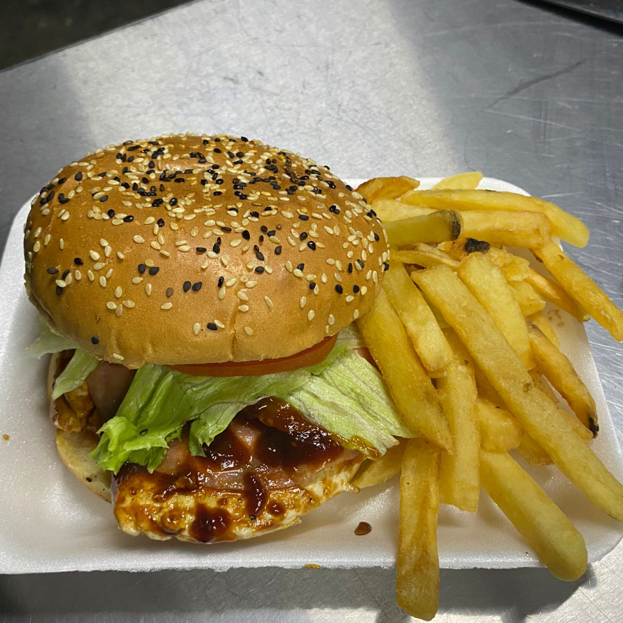 Pan para hamburguesa, con aderezo chipotle, encima pechuga de pollo cocida a la parilla bañada de BBQ,jamon, queso amarillo americano, lechuga, tomate, cebolla, aguacate y pan. Complementos: Papas a la francesa y chile en vinagre.