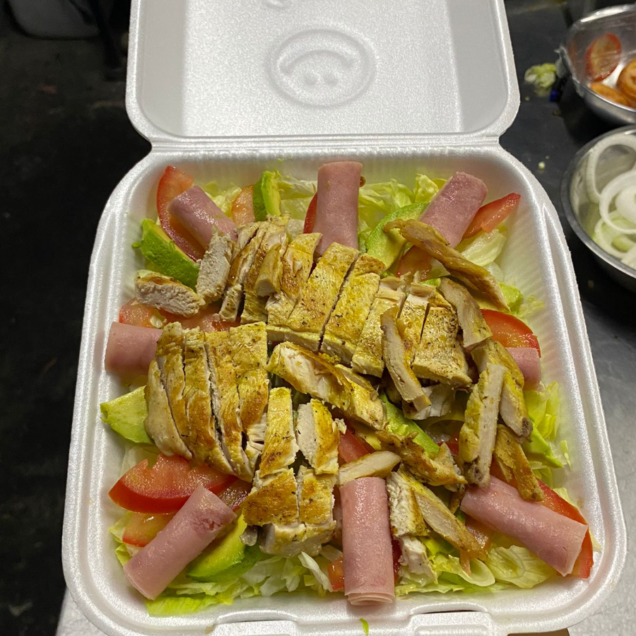 Pollo parrillado cortado en tiras, con rebanas de tomate y aguacate, y rollitos de jamon, todo sobre una cama de lechuga. Complementos: aderezo chiipotle y tenedor.