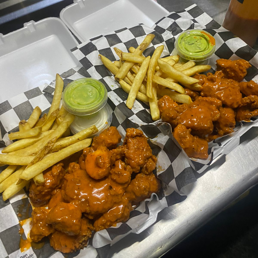 Pechuga de pollo en trozo, empanizada, con receta de la casa. Complementos: Papas a la francesa, ranch, guacamole y salsa al gusto.