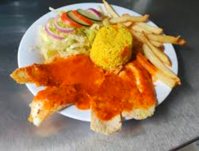500 g De pescado frito bañao de un guiso de la casa de camarón, con ensalada, arroz y papas.