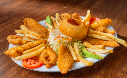 Filete empanizado, camarones empenizados, camarones envueltos, posta de mojarra, tostada de ceviche, arroz, ensalada y papas.