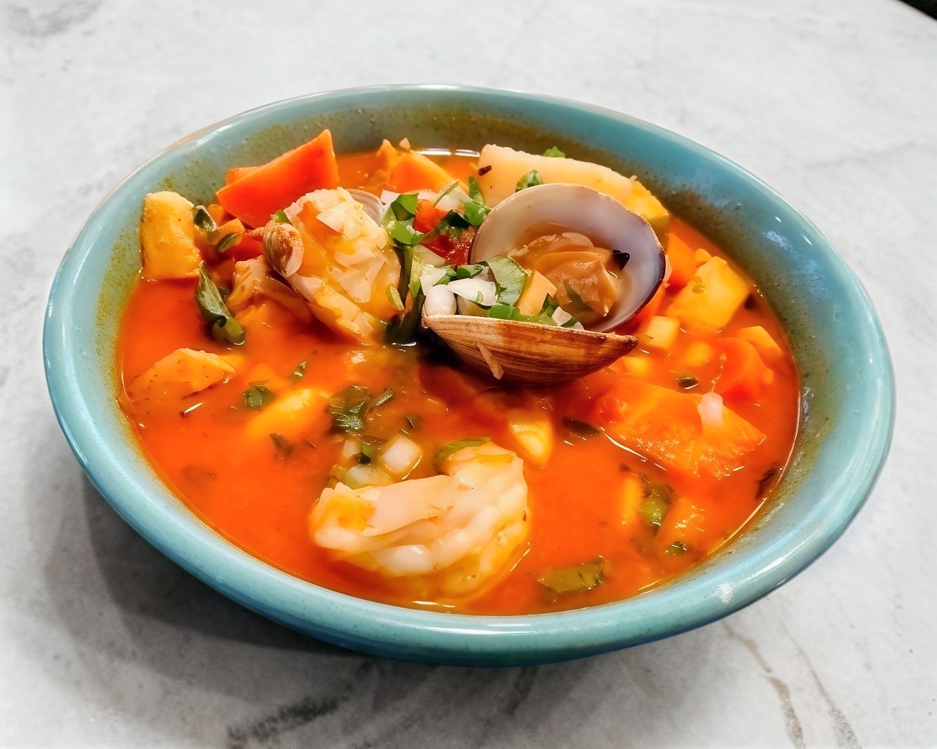 Caldo con mariscos frescos, filete, camarón, camarón makuil, surimi, jaiba, almeja, calamar.