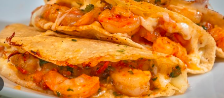 Delicioso taquito con guiso especial de camarón con tocino, con una capa de queso gouda acompañado de ensalda y aguacate.