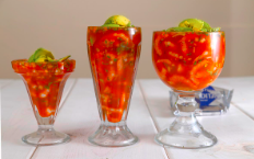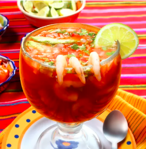 Mezcla de jugo especial del compare, con camarón cocido, cevichito, calamar fresco,surimi y su deliciosa porción de aguachile en salsonas negras.