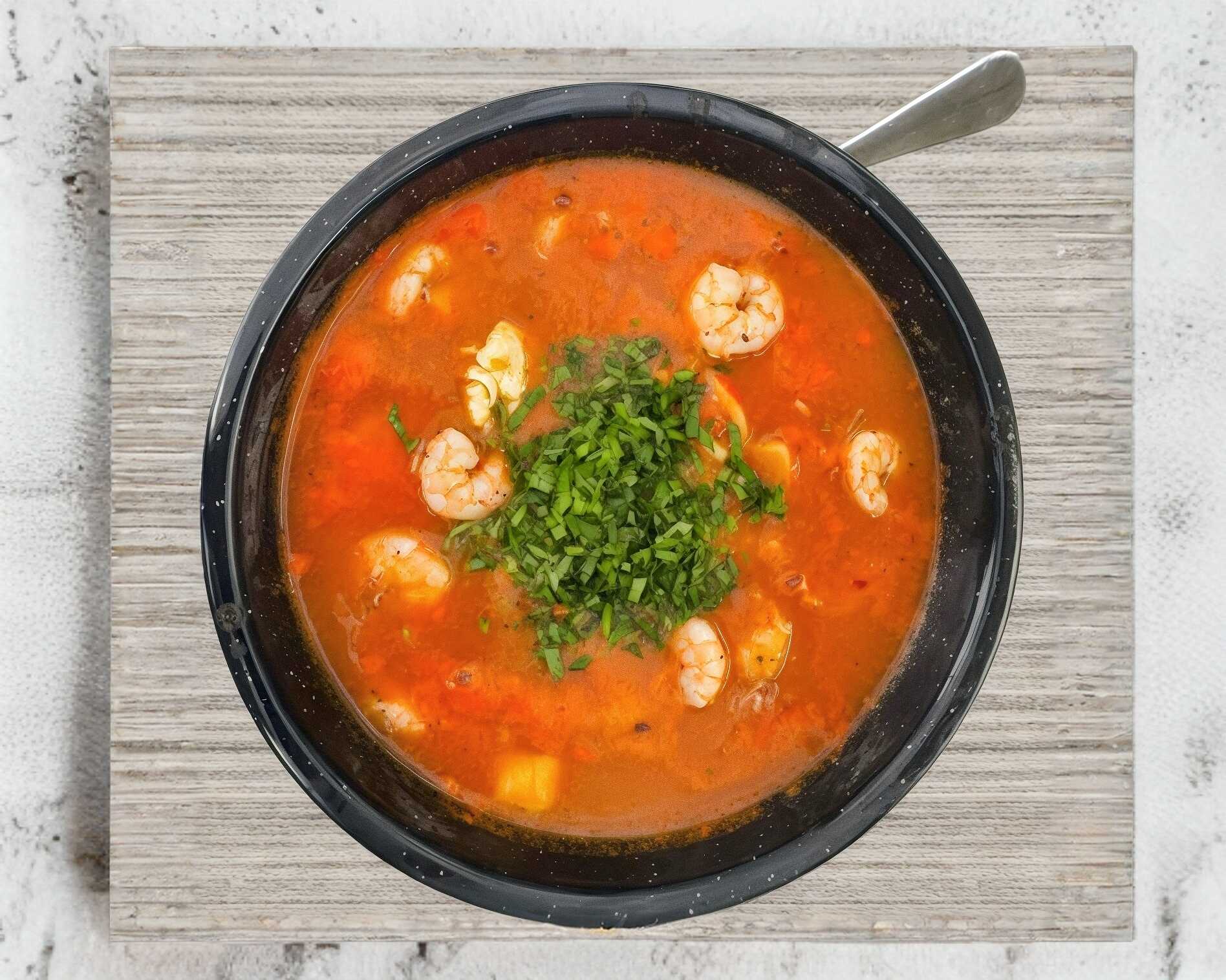 Caldo casero tradicional de pescado con camarón fresco.