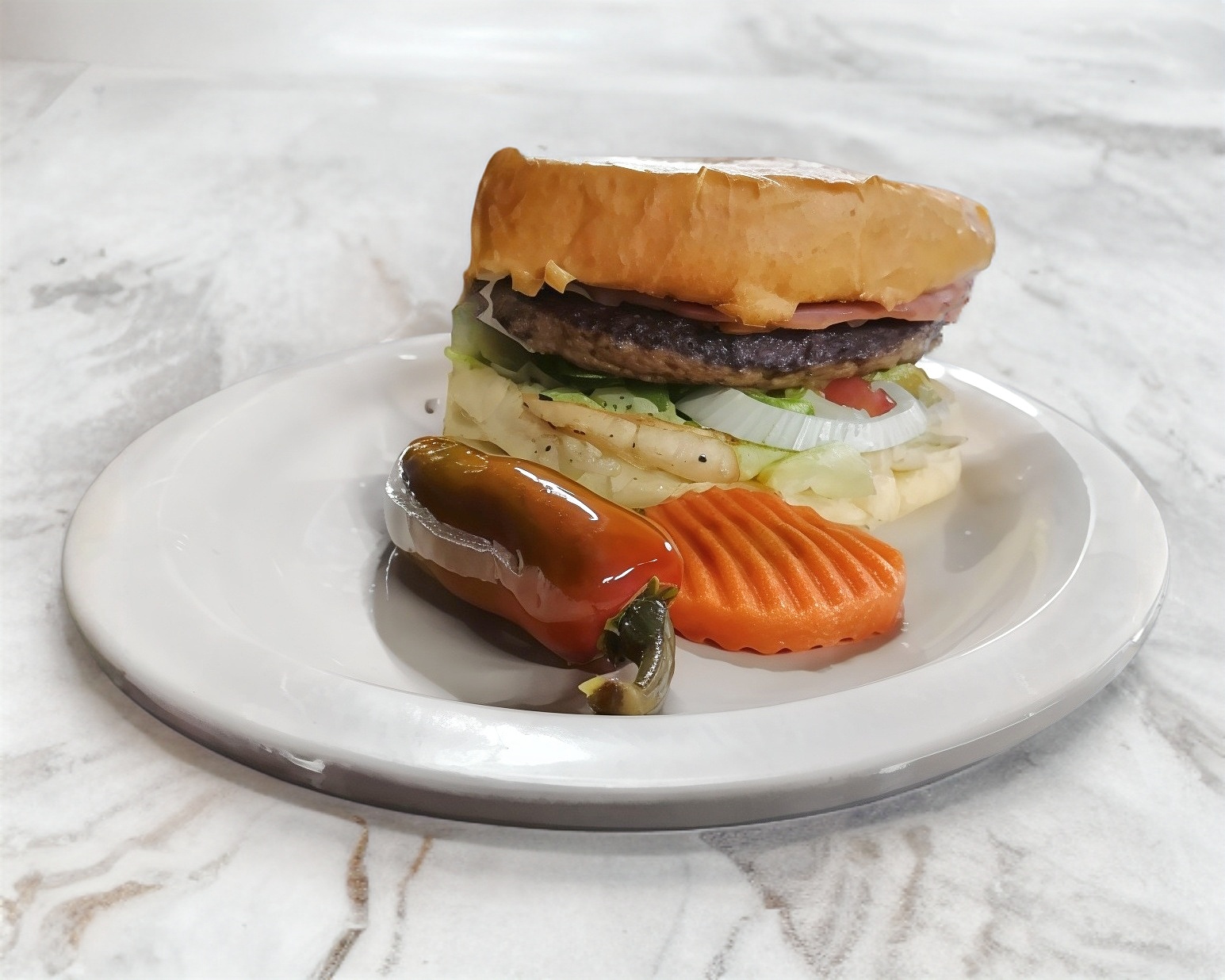 Lleva carne de res 110 g, lechuga, tomate, cebolla, jamón, queso amarillo y los aderezos.