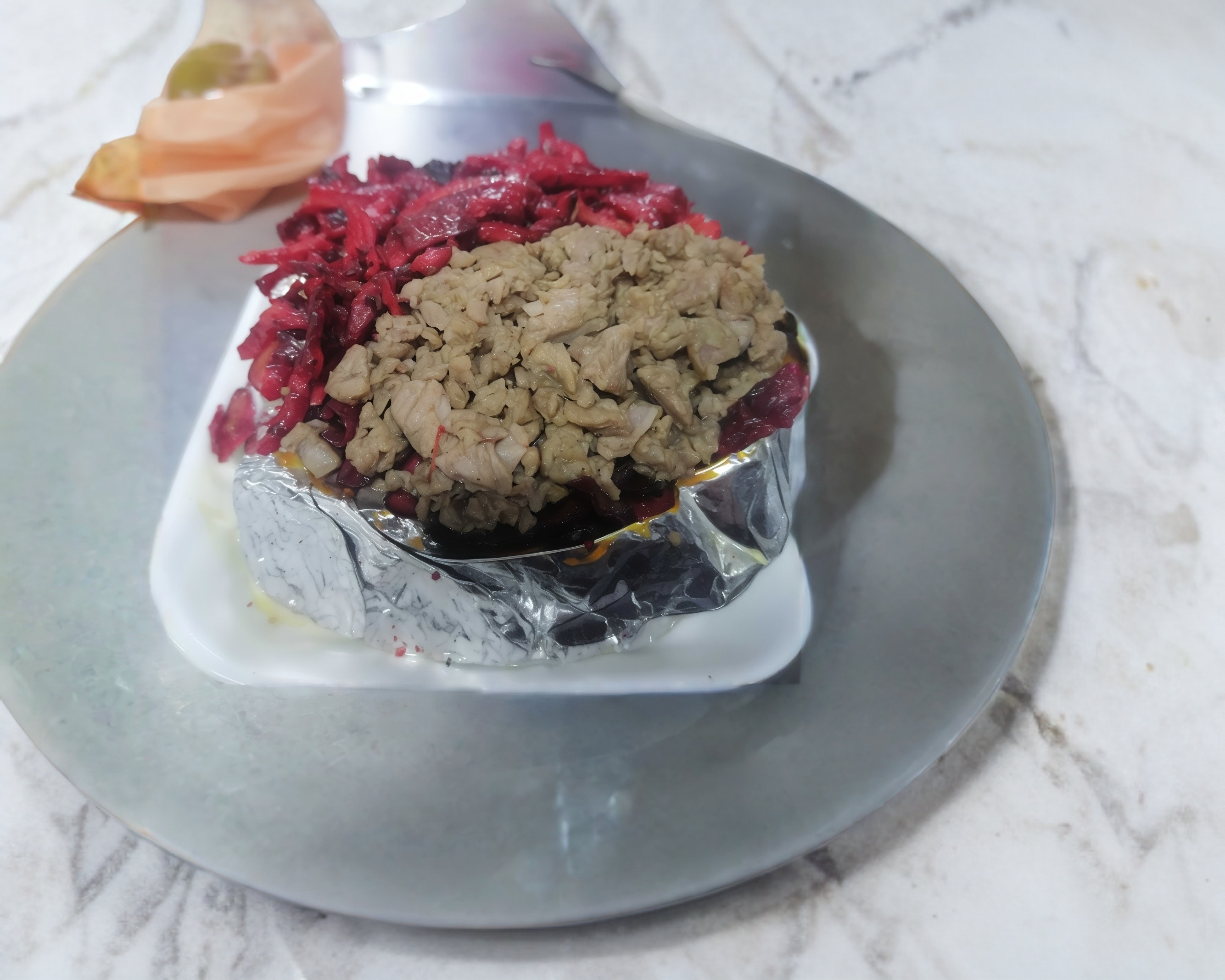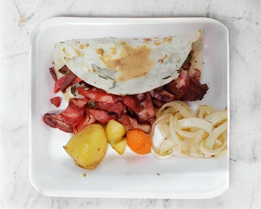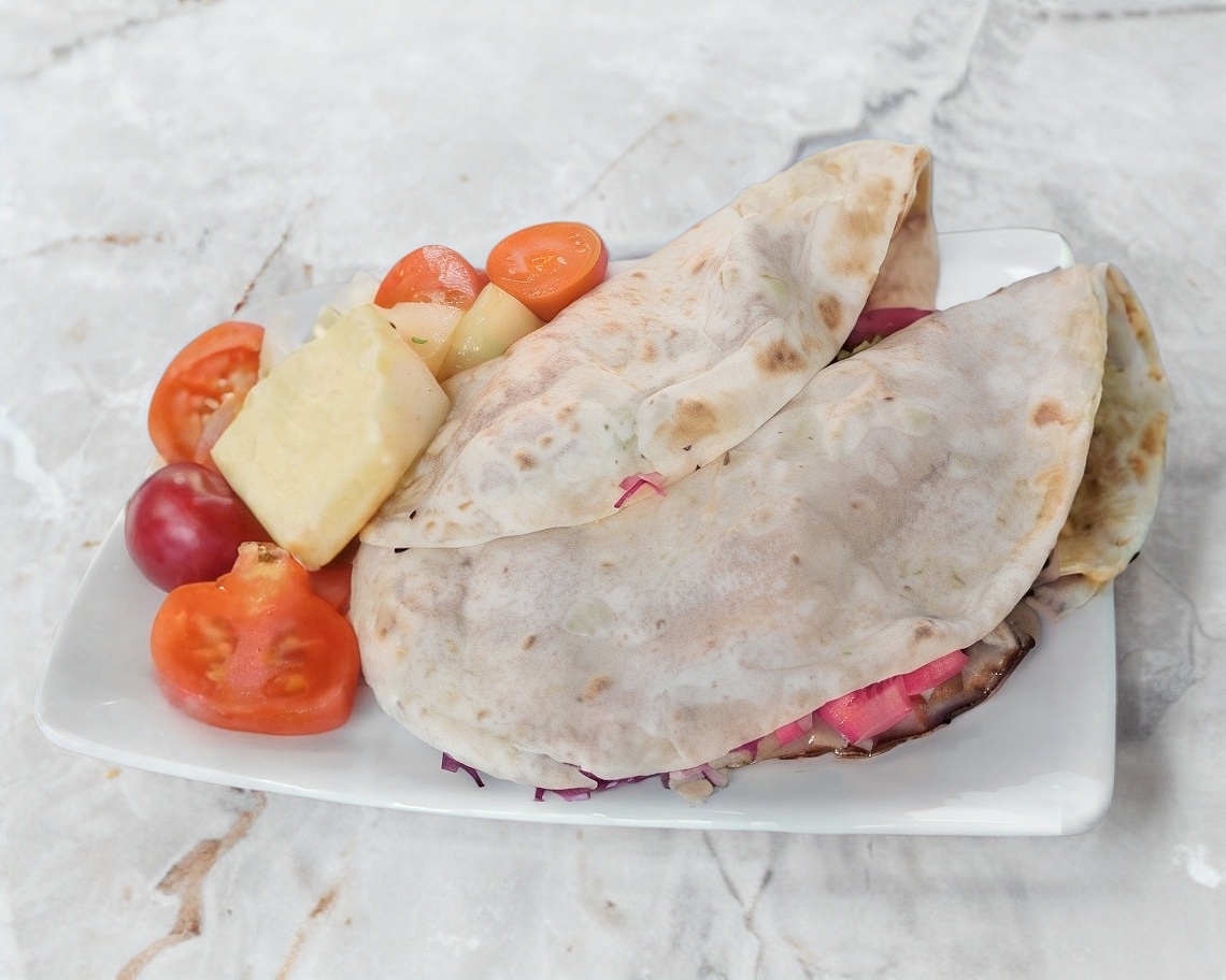 Tortilla de harina: lleva carne al pastor y res, se acompaña con cebolla guisada, cebolla, cilantro y limones.