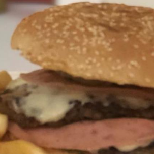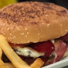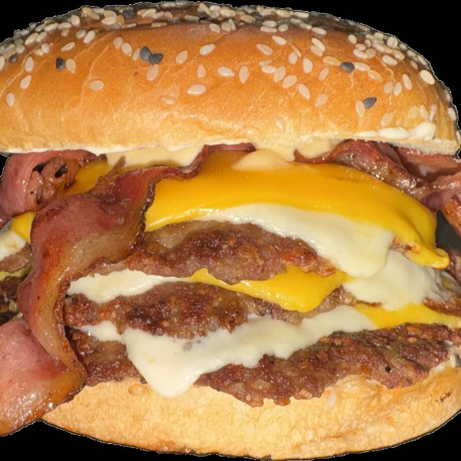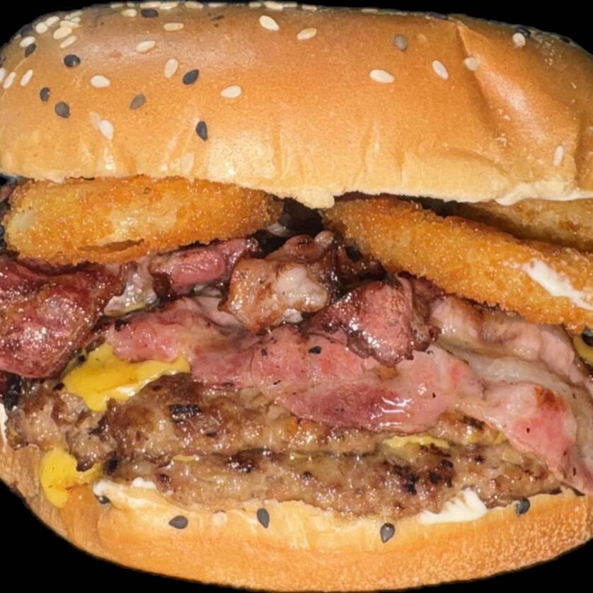 2 CARNES, MUCHO TOCINO, DOBLE QUESO AMARILLO, AROS DE CEBOLLA, WIGLY´S BBQ SAUCE.(INCLUYE PAPAS A LA FRANCESA CON QUESO, RANCH, TOCINO DESHIDRATADO).