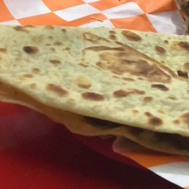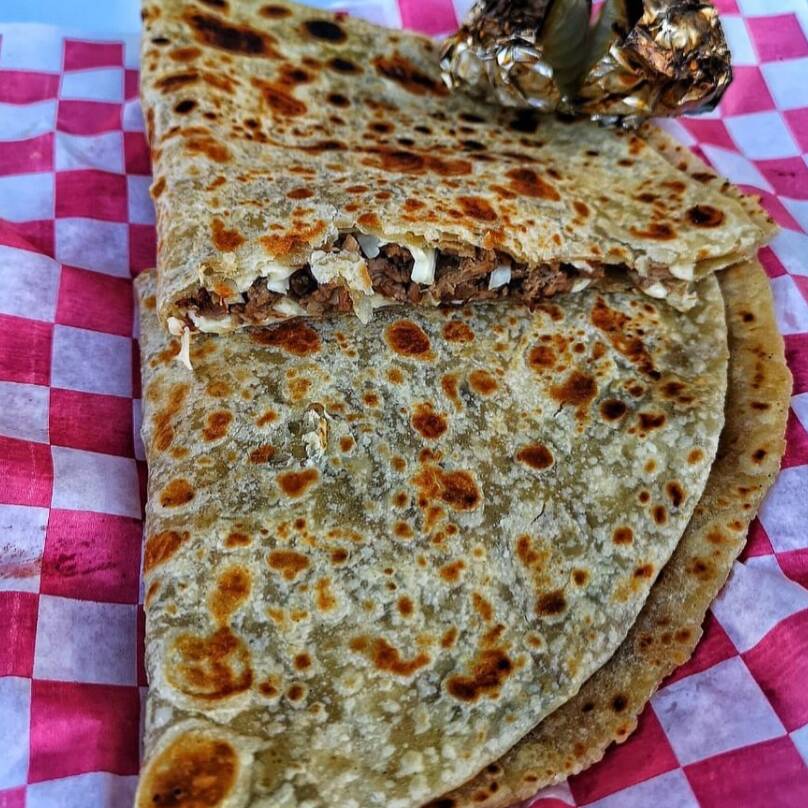 TORTILLA DE HARINA GIGANTE DE 33 CENTIMETROS, 200 GRAMOS DE QUESO CHIHUAHUA, 1/4 DE KILO DE SIRLOIN.(INLCUYE CEBOLLA ASADA,LIMÓN Y SALSA)