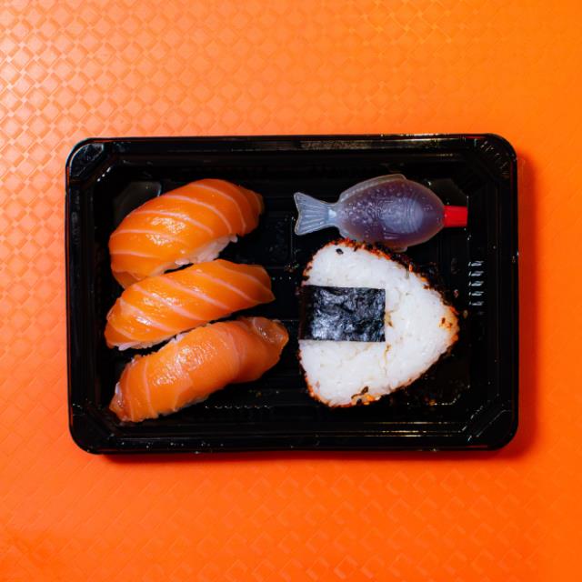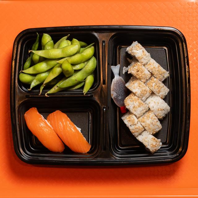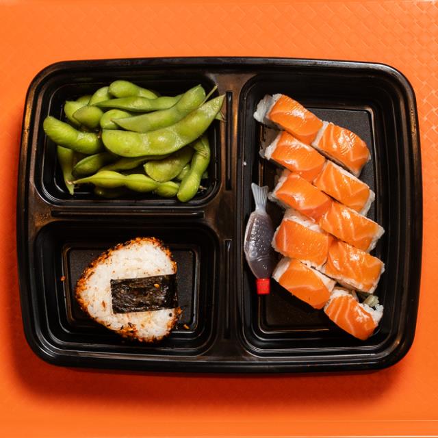 Edamames, Onigiri de Kanikama, Rollo de Salmon.
