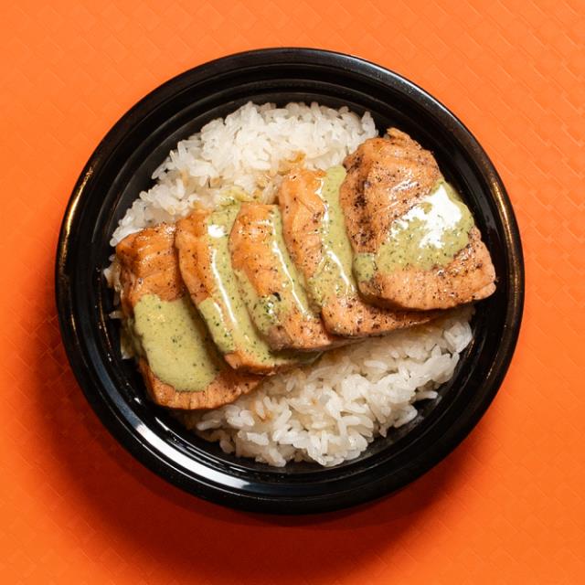 Salmon Sellado, Arroz Gohan, Salsa Cilantro.
