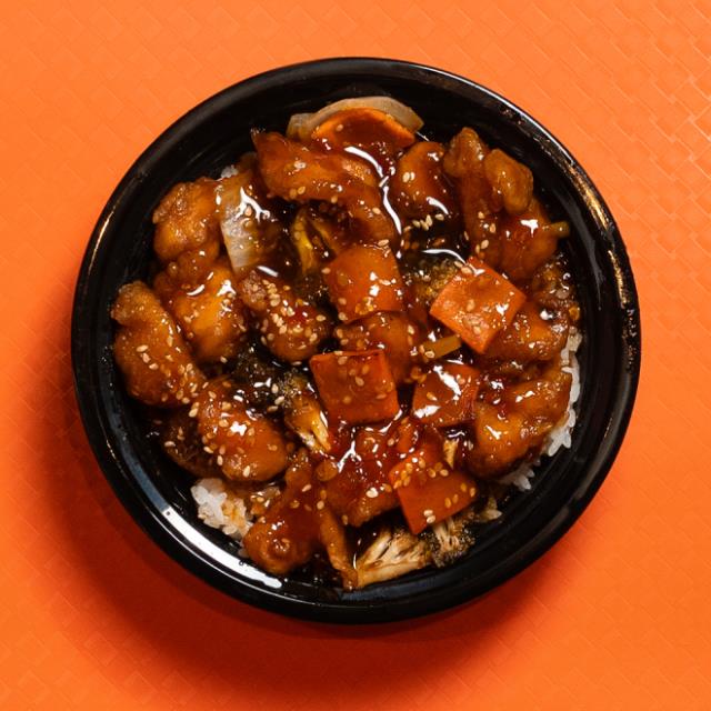 Pechuga de Pollo Frita, Arroz Gohan, Verduras, Salsa Hong-Kong.